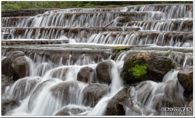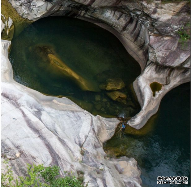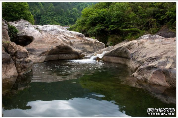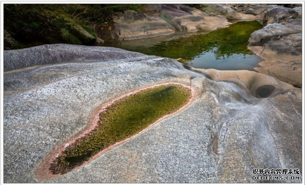 首先,来到半月形堰口,身旁的一汪碧潭似乎浅了不少,溪水留在堰口凹陷处,象一片片平整的玻璃镜面,将天光云影都搅入它的怀中。没有了想象中丝丝亮亮的小瀑布。此时心里嘀咕着,哎呀,来的不是时候。踏着一块块排列整齐的脚踏石带着思绪步入那个神秘莫测的峡谷中!
